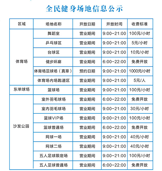 低收费场地包括VIP篮球场、VIP网球场、VIP羽毛球场和VIP五人制足球场、体育场田径跑道、体育场内的乒乓球区、体育舞蹈室等,低收费场地均低于市场同等场地价格,j9九游国际真人并推行会员消费制进一步打折优惠。 8月8日全民健身日期间所有场地均免费对群众开放。